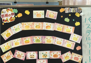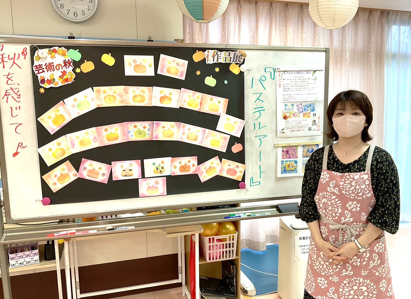 今回は10月ということもありハロウィンのカボチャと紅葉を描きました。初めての方もいましたが指の使い方がとても上手だったり、色の選びかたが綺麗だったりと私もワクワクする作品がたくさん完成しました。